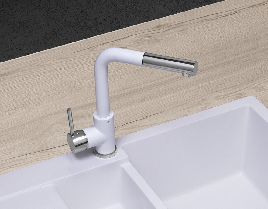 Dřezová baterie BDG4527wh je zpracována v elegantním, jednoduchém designu ve tvaru písmene L. Povrch baterie tvoří kvalitní barva s designem granitového povrchu v kombinaci s lesklými chromovými detaily. Dokonale ladí s bílými granitovými dřezy Concept. Tento model nabízí další 4 barevné varianty: černá (BDG4527bc), béžová (BDG4527be), tmavě šedá (BDG4527dg) a lesklá chromová (BDC4527).